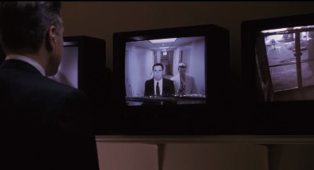 Cooper is doubled (foreshadowing his doppelganger that he will meet in the finale of the TV series) existing in the hallway whilst he watches himself on the screen. This double is caused by the appearance of Jeffries, who has lived in the dream world, and it is this security footage of the double that asserts the fact that Jeffries was actually in the reality of the FBI offices at the end of the scene. Jeffries is another emblem of the dream world, like Leland and Cooper when they were possessed by BOB, and his appearance has disrupted the conventions of reality (time and space) within the FBI offices.