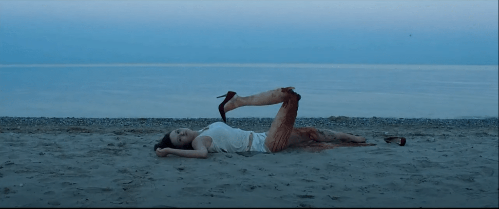 We cut to an image of Annie the next morning, lying dead on the beach. One of her feet is missing, and her leg is broken at a right angle.